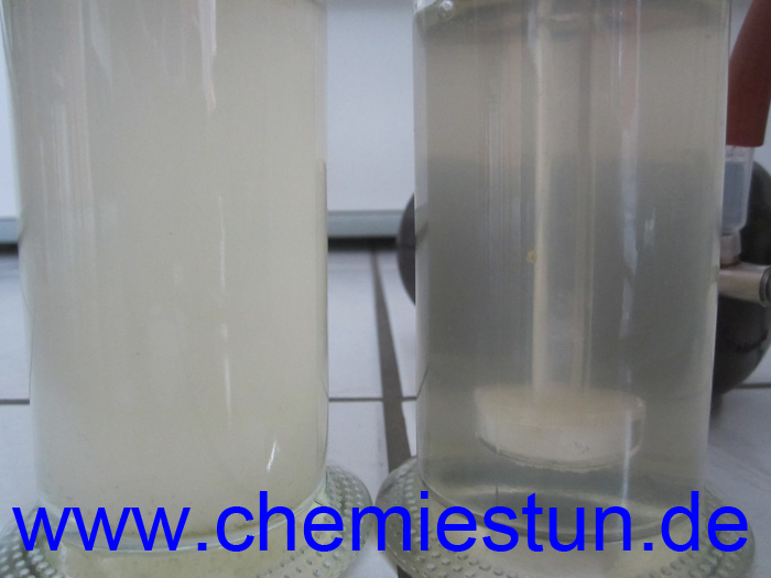 Die Schwefelsäure wird vorsichtig in ein trockenes Reagenzglas gegeben. Das Reagenzglas wird schräg eingespannt. Tropfenweise wird das Ethanol zugegeben. Die beiden Flüssigkeiten dürfen sich nicht [...]